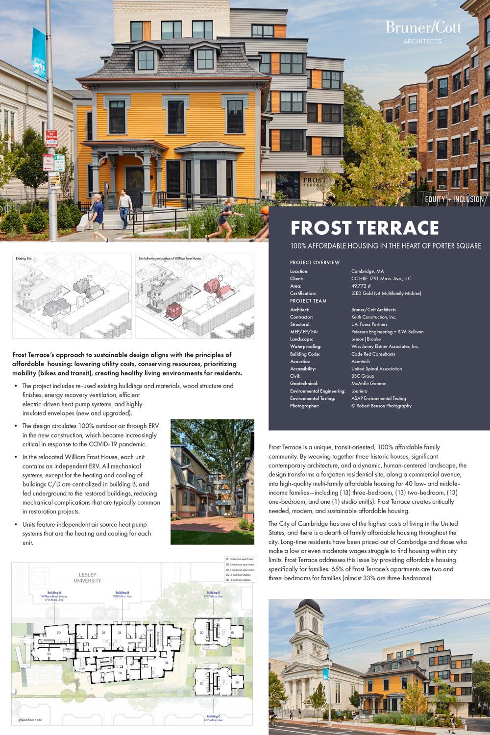 Frost Terrace is a unique, transit-oriented, 100% affordable family community. By weaving together three historic houses, significant contemporary architecture, and a dynamic, human-centered landscape, the design transforms a forgotten residential site, along a commercial avenue, into high-quality multi-family affordable housing for 40 low- and middle-income families—including (13) three-bedroom, (13) two-bedroom, (13) one-bedroom, and one (1) studio unit(s). Frost Terrace creates critically needed, modern, and sustainable affordable housing.