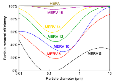Figure 1: Graph compares particle removal efficiency depending on filter type and particle size. (source: http://built-envi.com/publications/nafa_iit_wellsriley%20-%20FINAL.pdf)
